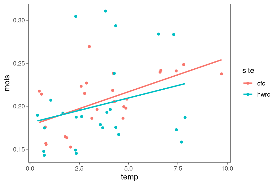 ggplot(aes(x = temp, y = mois, col = site, group = site)) +