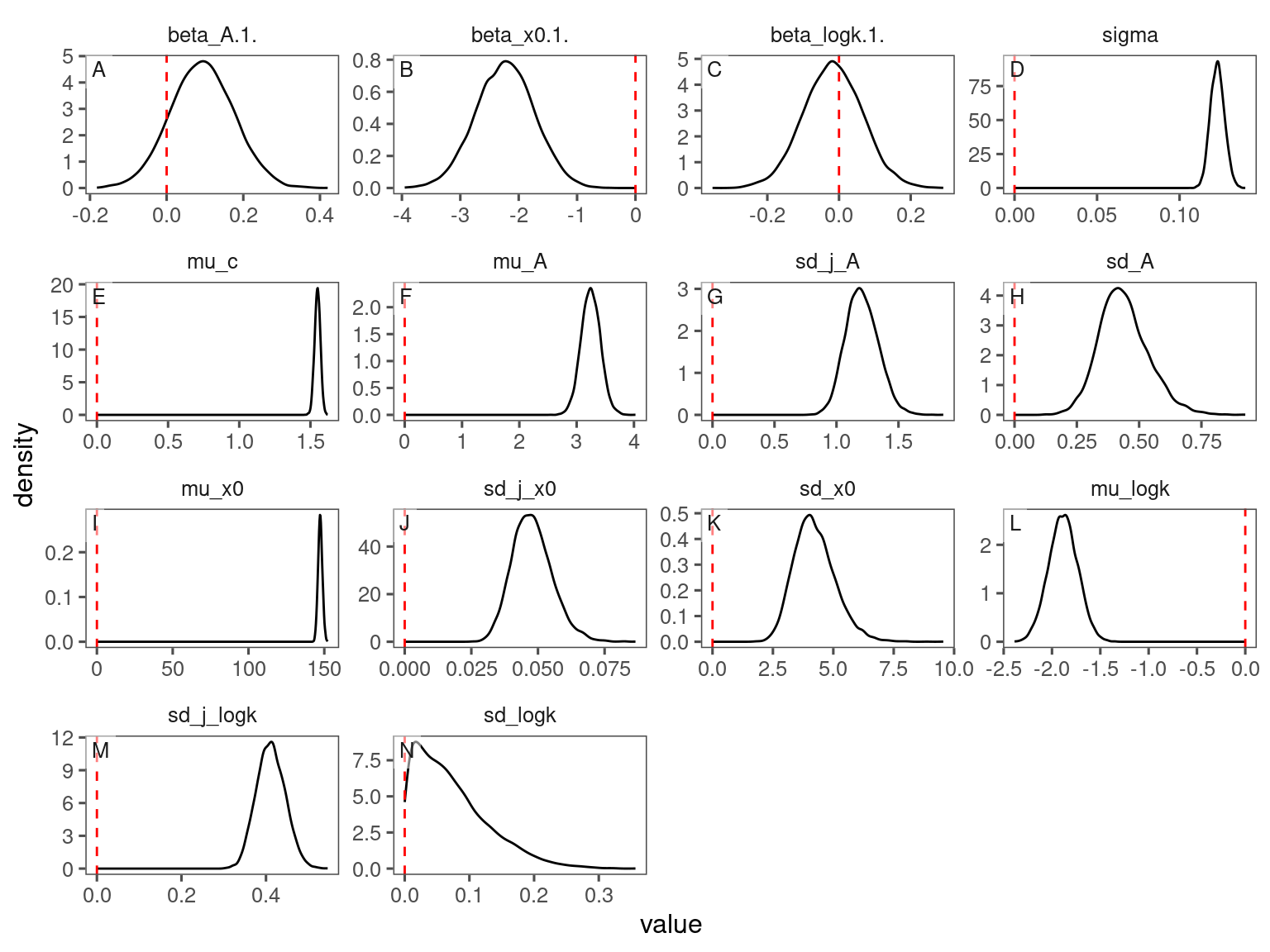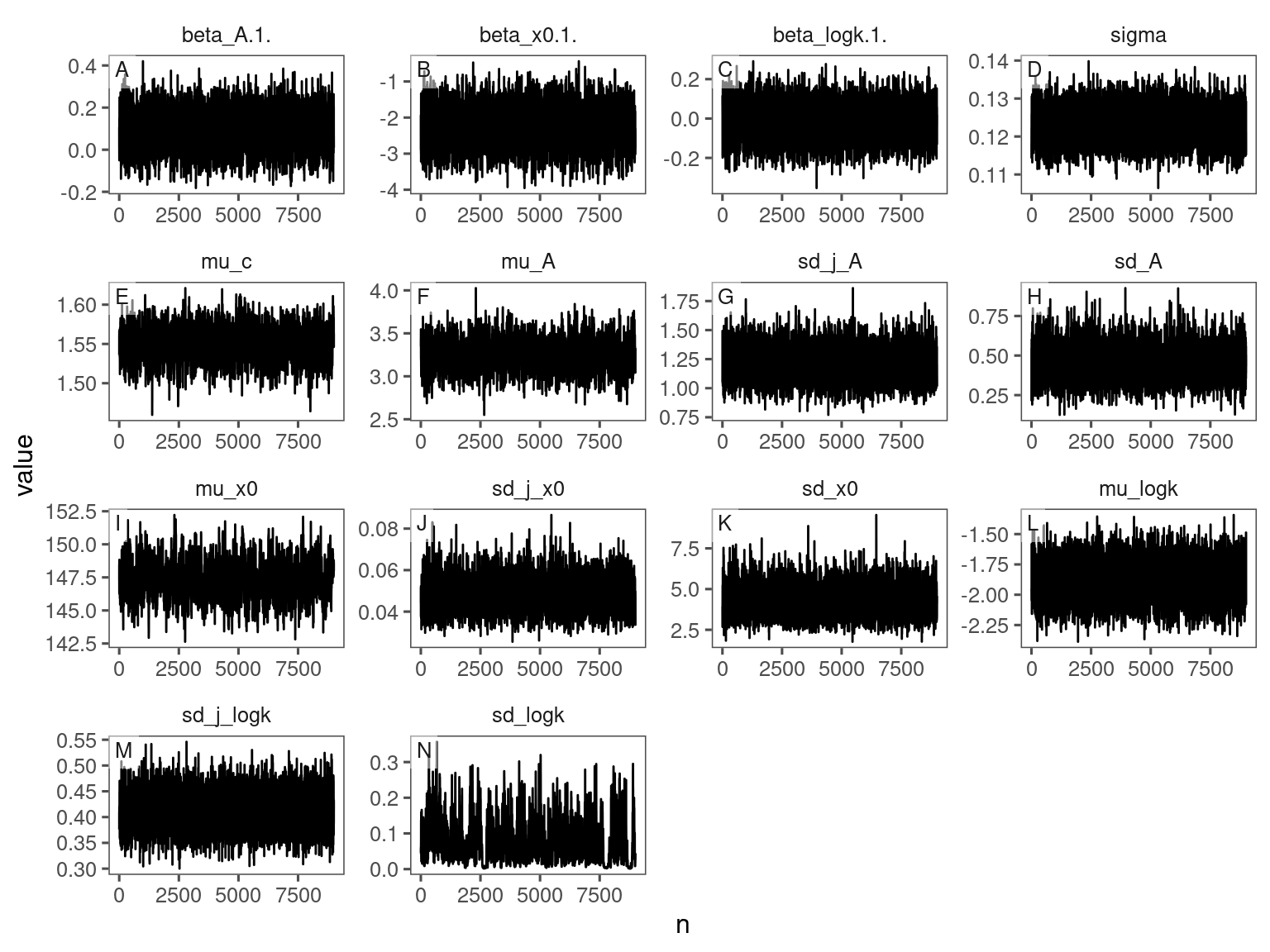 \[\begin{align*} c &\sim \text{Uniform}(0, 3) \newline \mu_A &\sim \text{Uniform}(1, 6) \newline \beta_A &\sim \text{Normal} (0,0.5)\newline \tau_A &\sim \text{Truncated Normal}(0, 0.25, 0, \infty) \newline \sigma_A &\sim \text{Truncated Normal}(0, 0.5, 0, \infty) \newline \mu_{x_0} &\sim \text{Uniform}(120, 180) \newline \beta_{x_0} &\sim \text{Normal} (0,5)\newline \tau_{x_0} &\sim \text{Truncated Normal}(0, 2.5, 0, \infty) \newline \sigma_{x_0} &\sim \text{Truncated Normal}(0, 5, 0, \infty) \newline \mu_{log(k)} &\sim \text{Uniform}(-3.5, 0) \newline \beta_{log(k)} &\sim \text{Normal} (0,0.1)\newline \tau_{log(k)} &\sim \text{Truncated Normal}(0, 0.05, 0, \infty) \newline \sigma_{log(k)}^2 &\sim \text{Truncated Normal}(0, 0.1, 0, \infty) \newline \sigma^2 &\sim \text{Truncated Normal}(0, 1, 0, \infty) \end{align*}\]