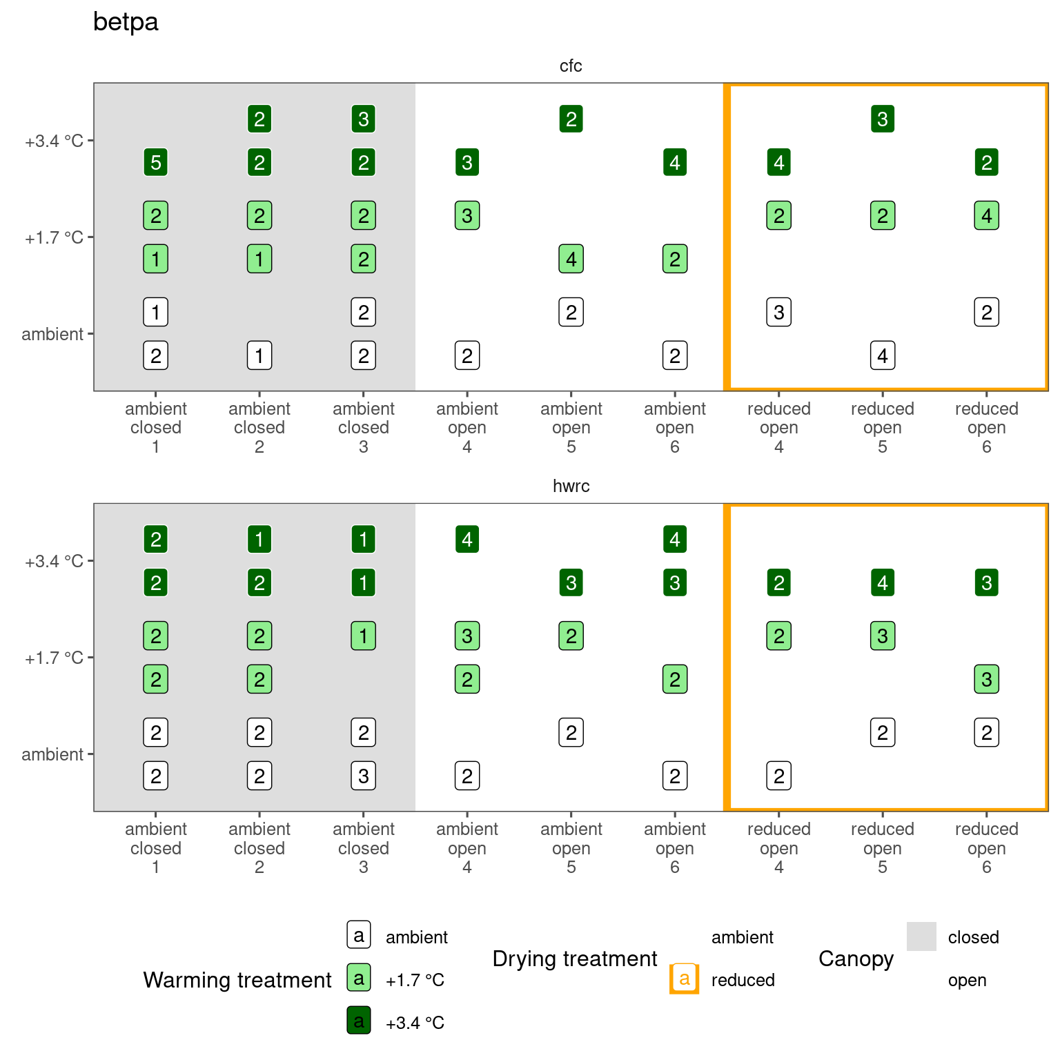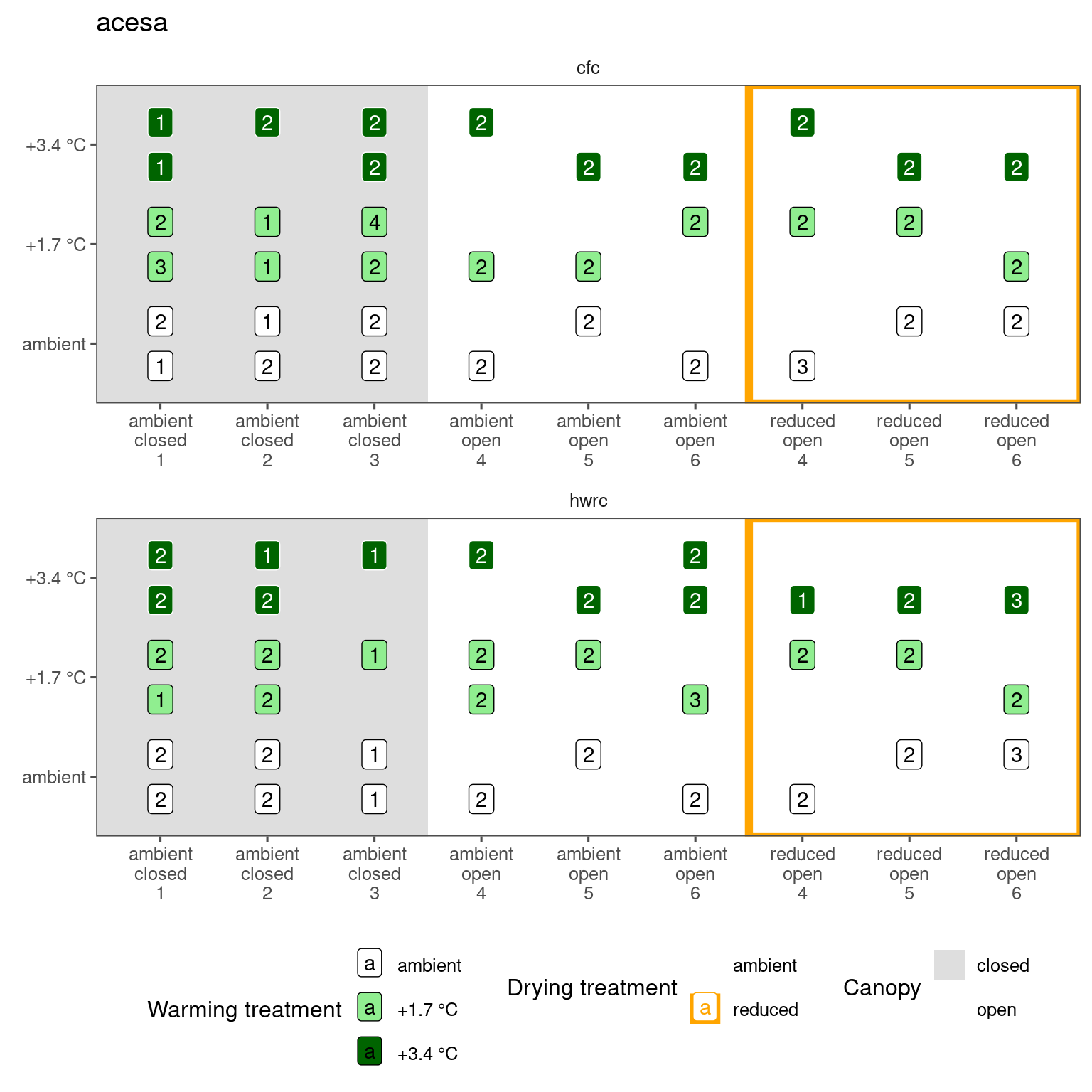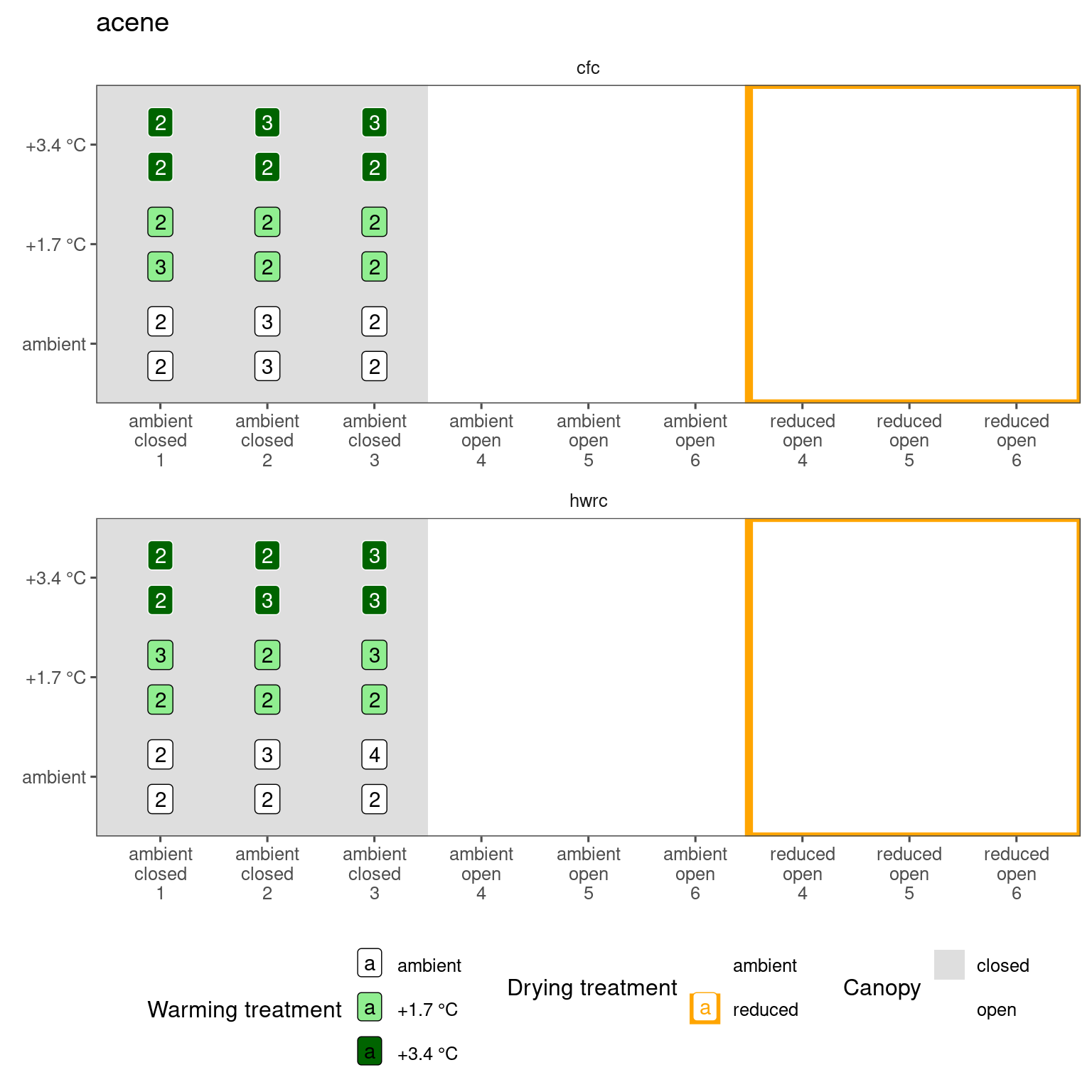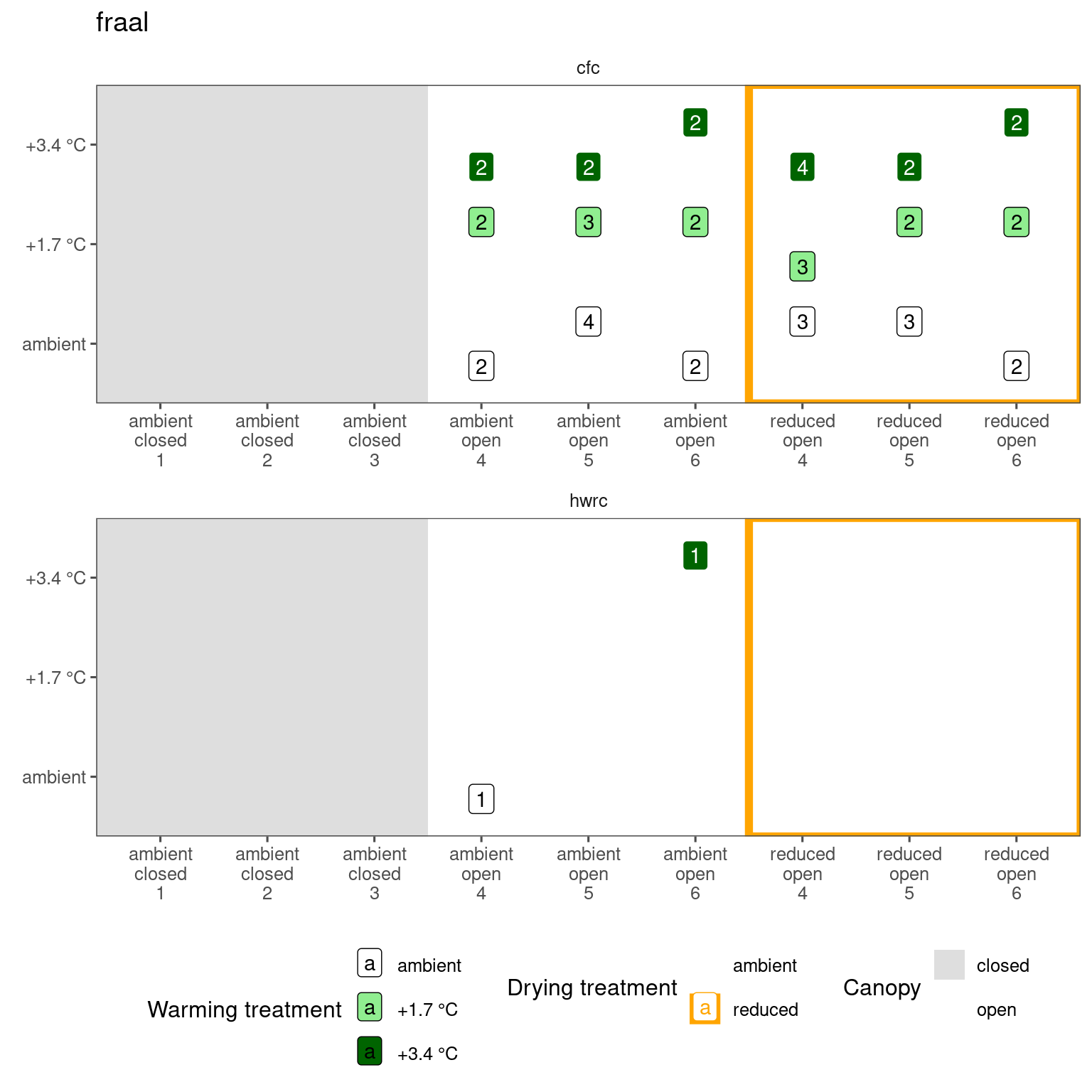 These figures illustrate the maximum number of individual plants sampled within a species, site, year, treatment, block, and plot. The purpose are to 1) visualize study design, 2) clarify sample size, and 3) spot potentially problematic data.