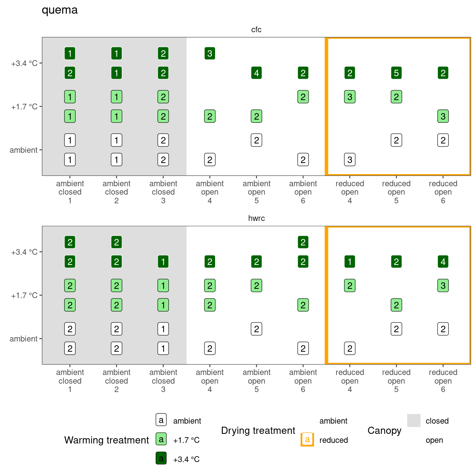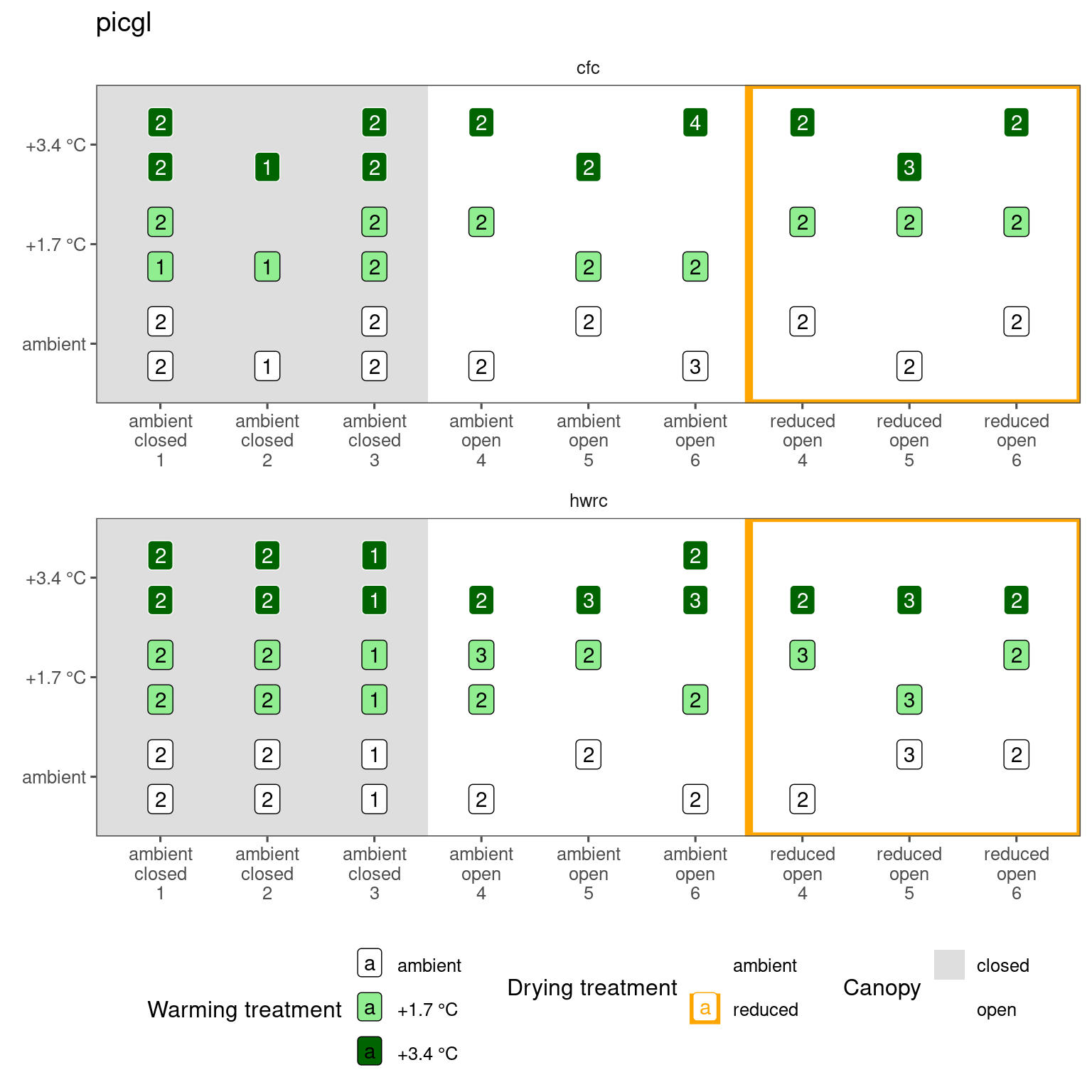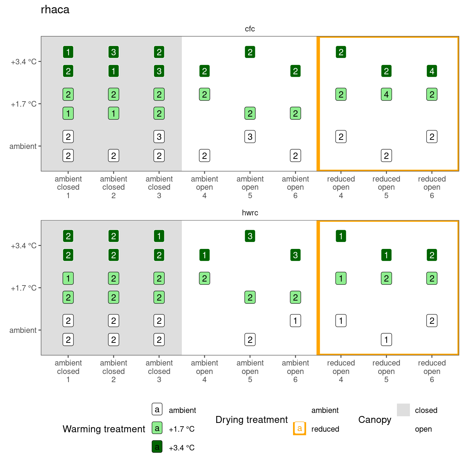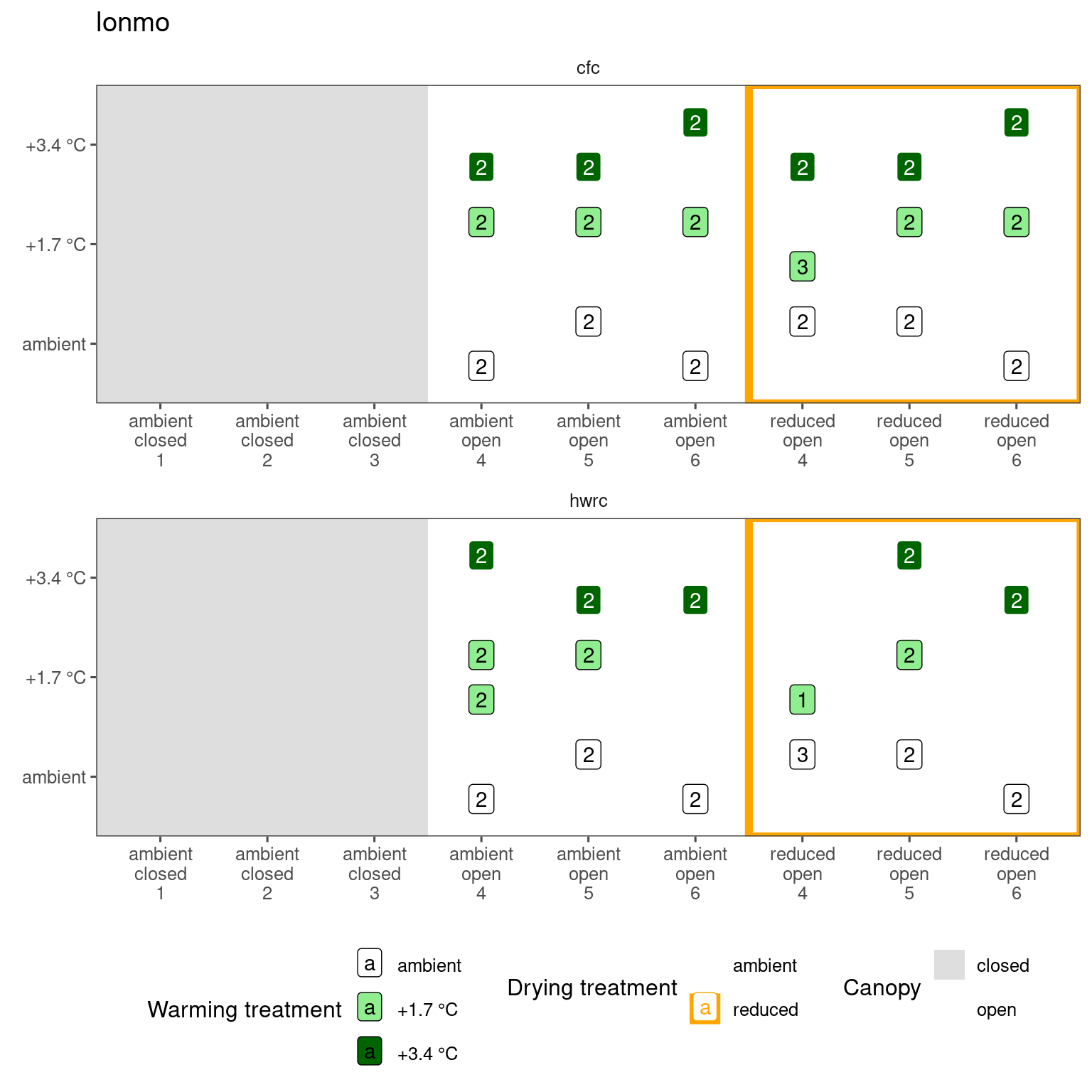 These figures illustrate the maximum number of individual plants sampled within a species, site, year, treatment, block, and plot. The purpose are to 1) visualize study design, 2) clarify sample size, and 3) spot potentially problematic data.