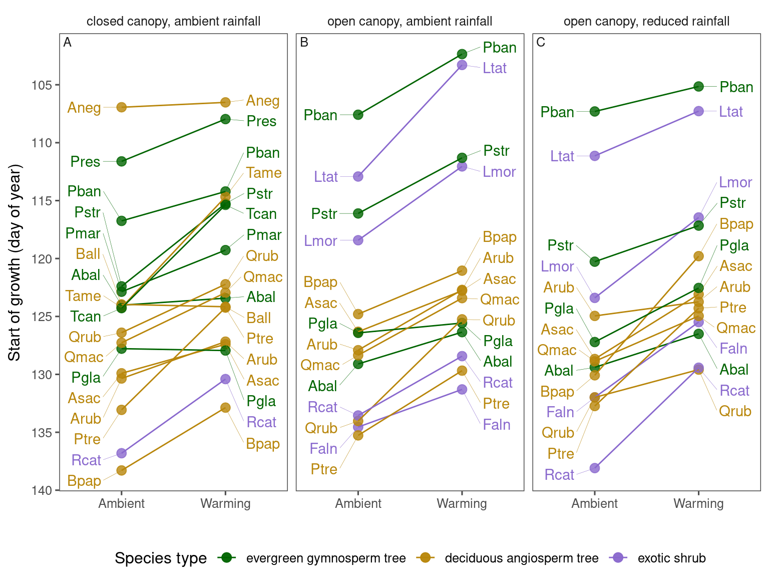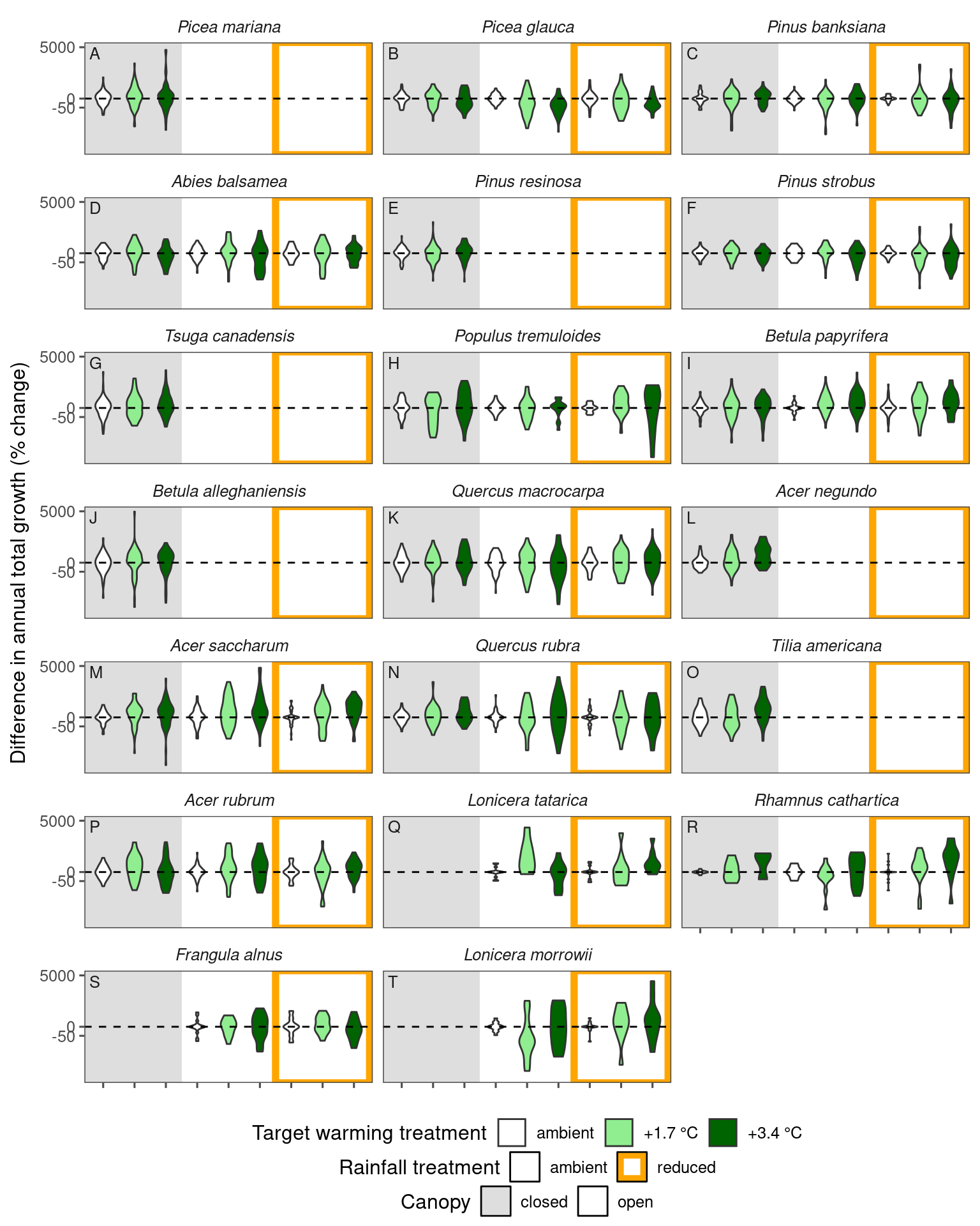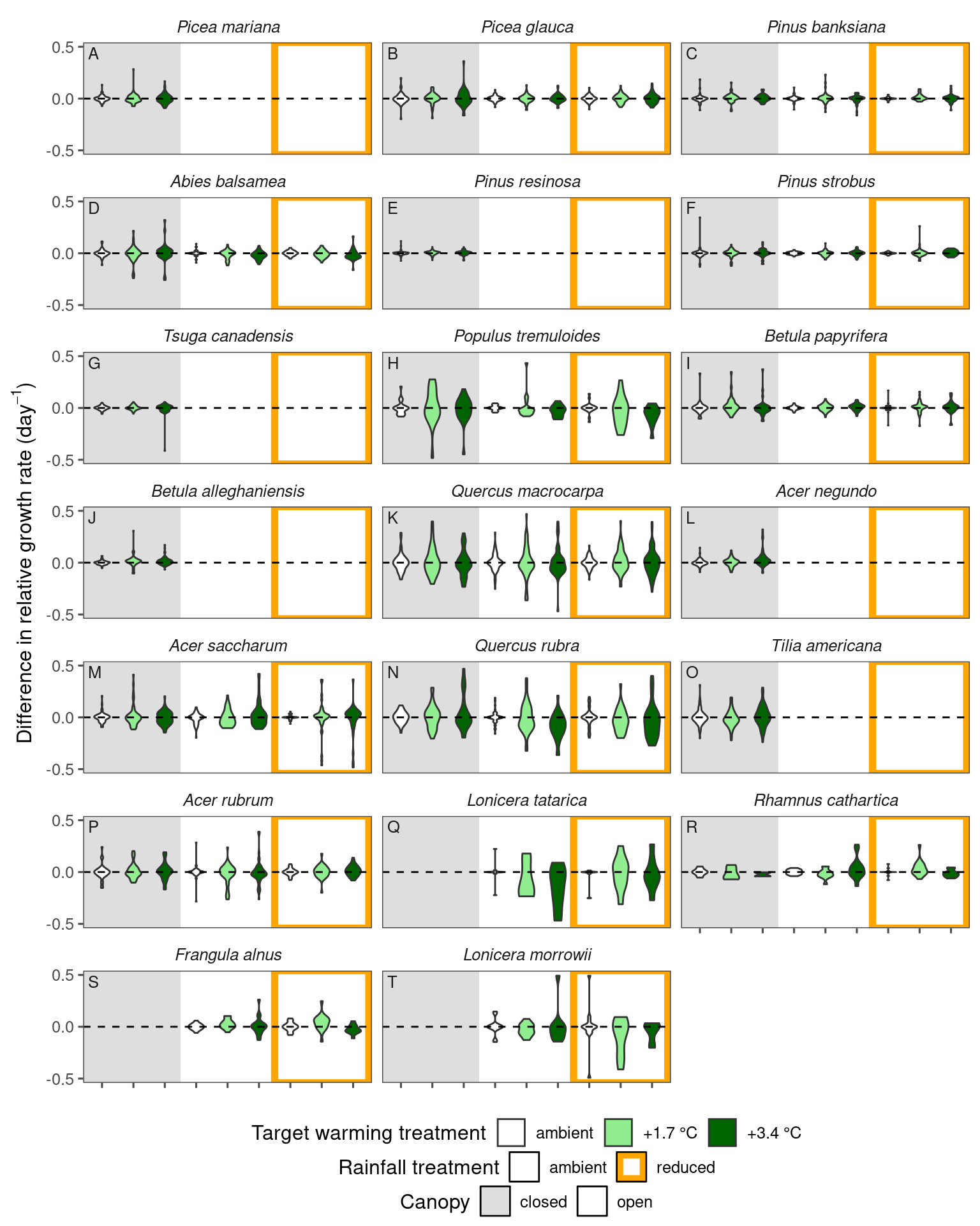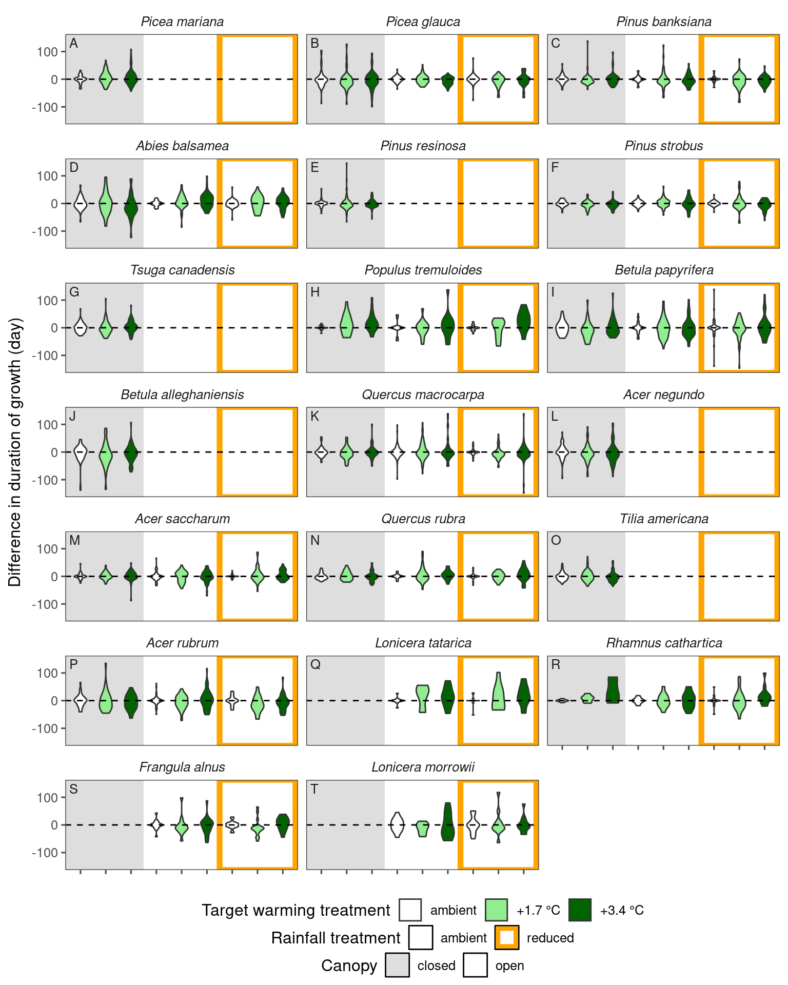 target warming treatment | rainfall treatment | canopy | difference in | difference in |