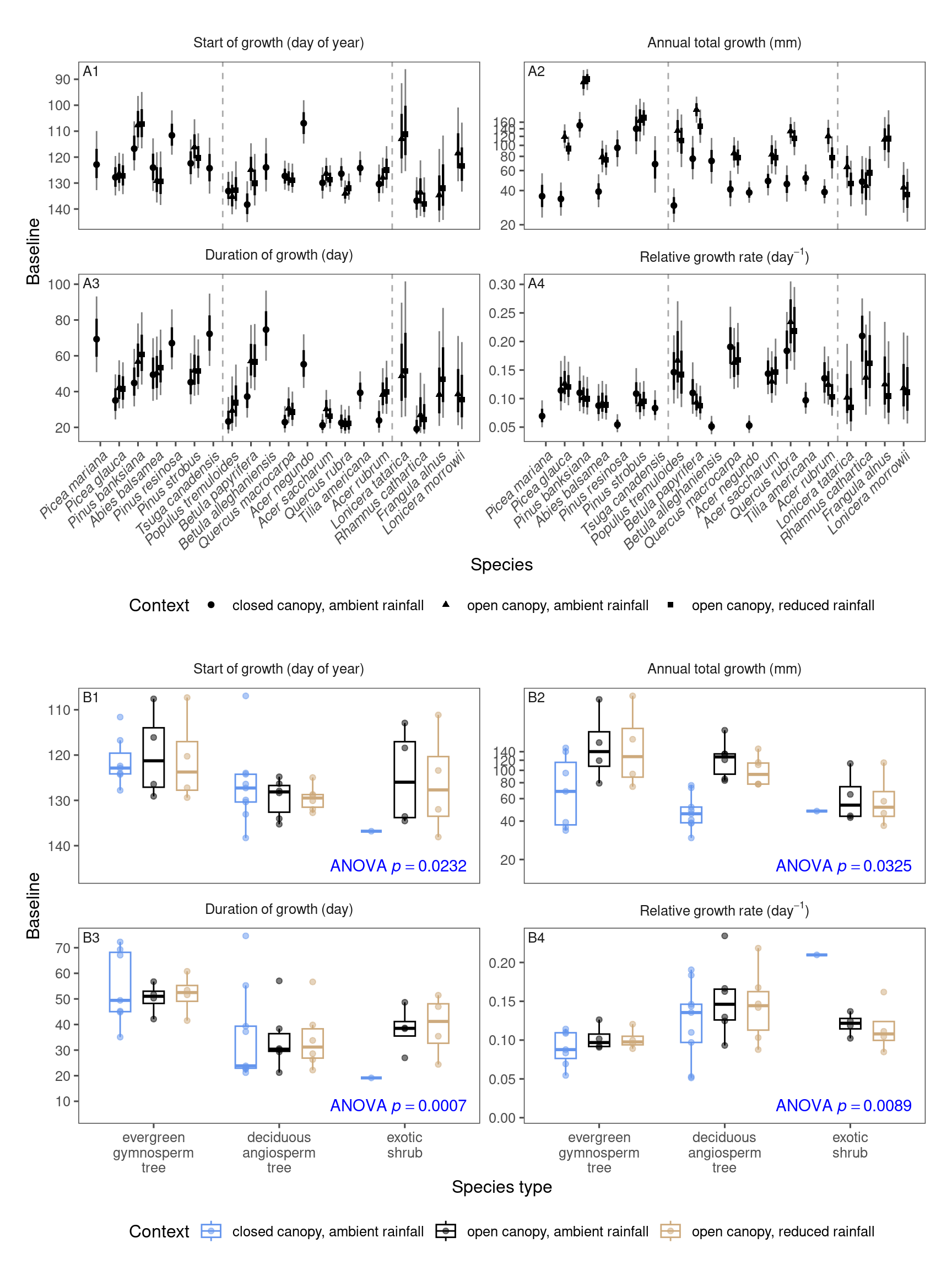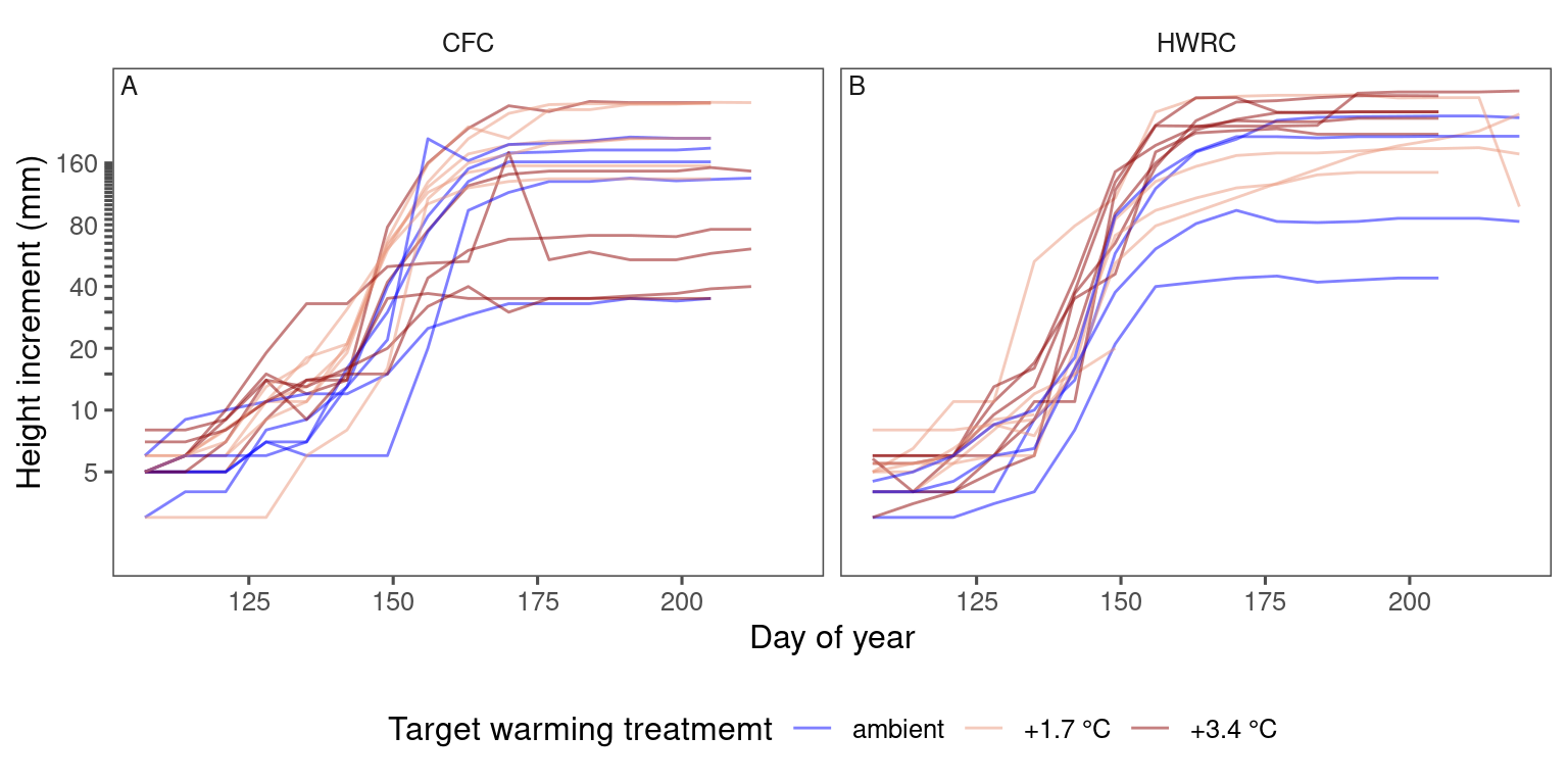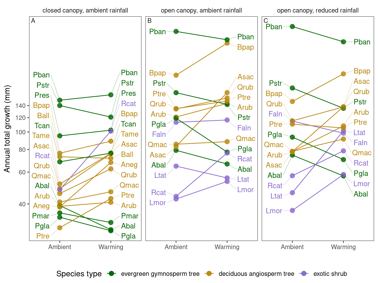 target warming treatment | rainfall treatment | canopy | difference in | difference in |